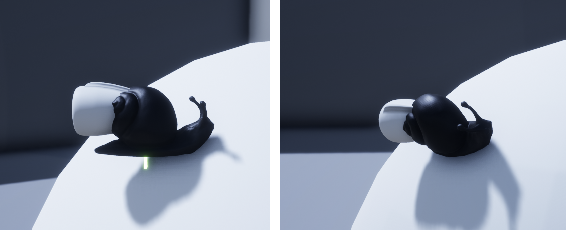 We had a little visual problem at this point: as we have a snail as the main character it was very odd to see him walking onto angled surfaces without rotating his body. Thus I created a function that was called on tick which ray traced down from where the snail was and rotated the snail based on the vertex normal direction on the floor beneath him: