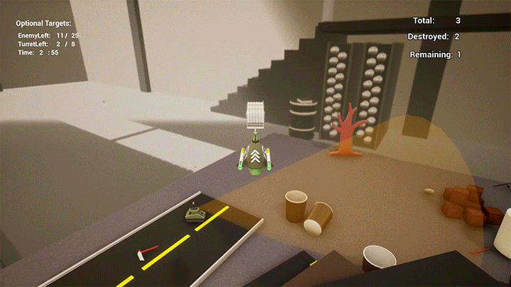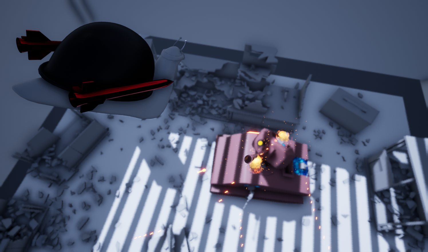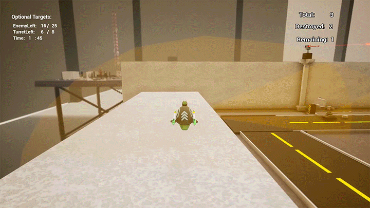 The tank was the most common enemy in the game, which also had the most complex logic. Each one of them is assigned a unique index and will patrol between his own patrol points until he sees the player. Upon engagement, the tank will try to close the distance by moving towards the player, and once in attack range will fire missiles from his cannon. The tank also checks per frame once engaged whether he still has a line of sight of his target, if that returns false he will go to the last known location of the target and spin around in place in search for target. He will either reengage if he finds the target again or retreats back to his patrol route if he does not.